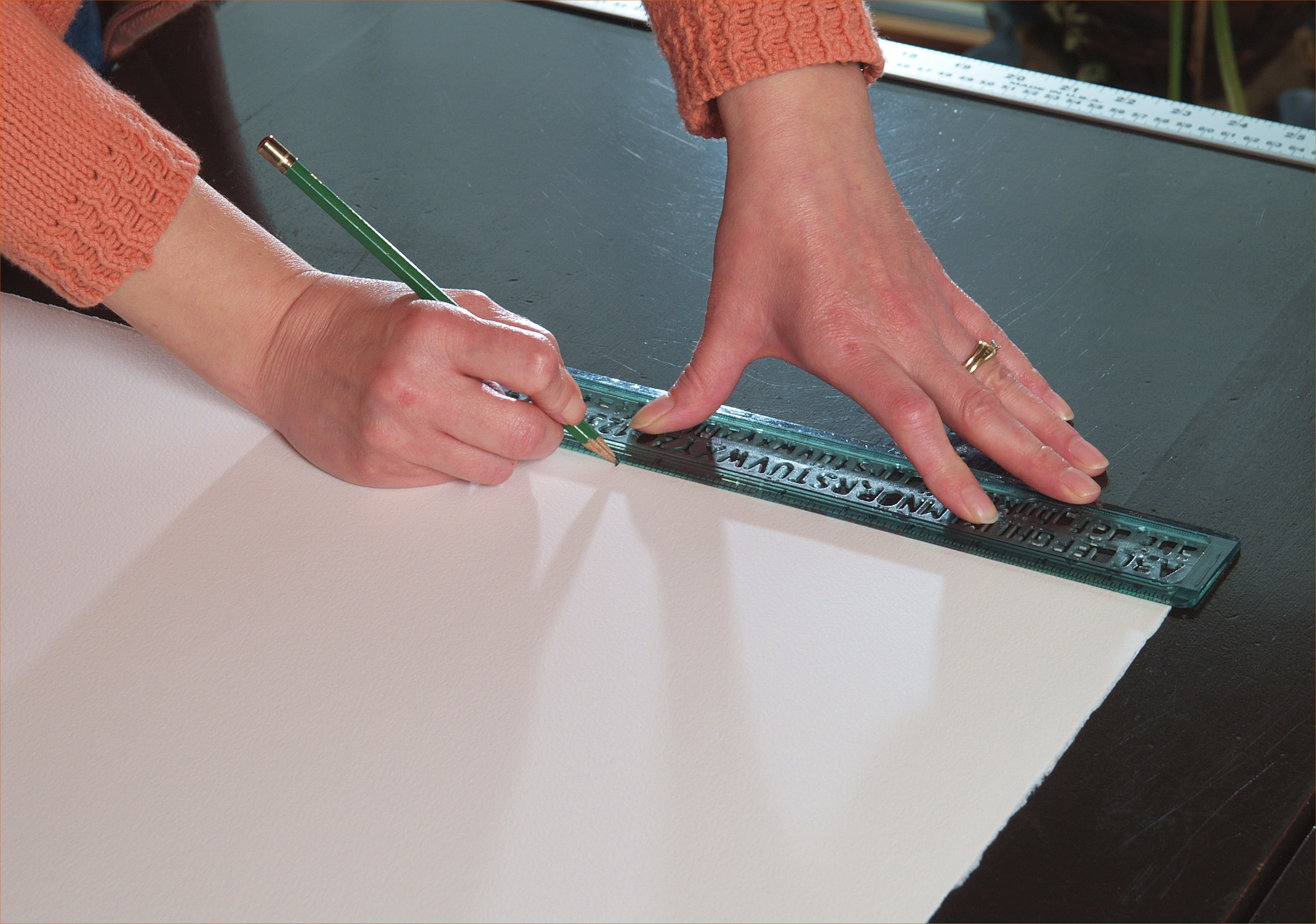 The following describes, step-by-step, how to divide a 30” x 22” (760 x 560cm) sheet of watercolor paper into 10” x 8 ½” (25.5 x 21.5cm) blocks. You may use either a ruler or yardstick. Whichever you use, before measuring, lay the paper lengthwise on your work surface with the embossed seal (e.g. the Winsor Newton logo) face up. This is the ‘right’ side of the paper, the one most suited for painting on.