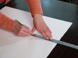 Working from left to right using a ruler or yardstick, measure and mark off the top and bottom edges of the paper in 10” (25.5cm) intervals. Don’t worry if there is a bit more than ten inches (25.5cm) at the far right, which may have a deckle (fringed) edge.
