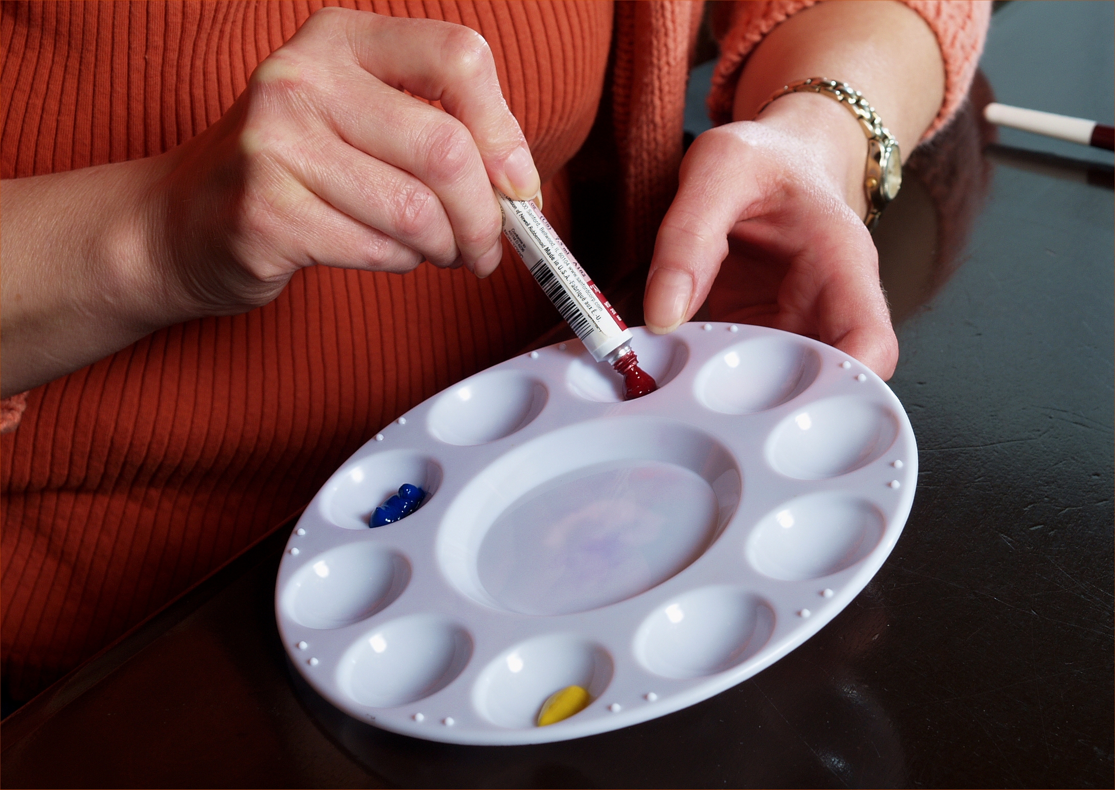 Choosing your colours: Select four to seven colours of tube paint and place a dime-size blob of each one on your palette.