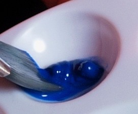 To load the brush, “drag” or “tease” the edge of it at the outside perimeter of the paint blob. Notice how the color seeps away from the blob into the droplets of water from your brush. If the paint on your brush is too thick to suit your tastes, you can use a bit more water to dilute the paint further. The more water, the less intense your color will be when it dries.