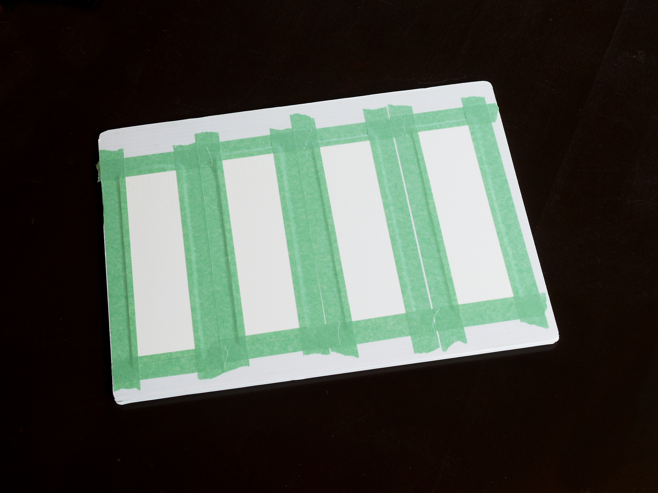 When you have cut all four strips, turn them face up (with the “x” visible) and arrange them on the backboard. I laid mine in a single row. They were easy to tape that way and it never occurred to me to do it differently, but you can set yours out any way that suits you. Don’t resist the urge to experiment!
