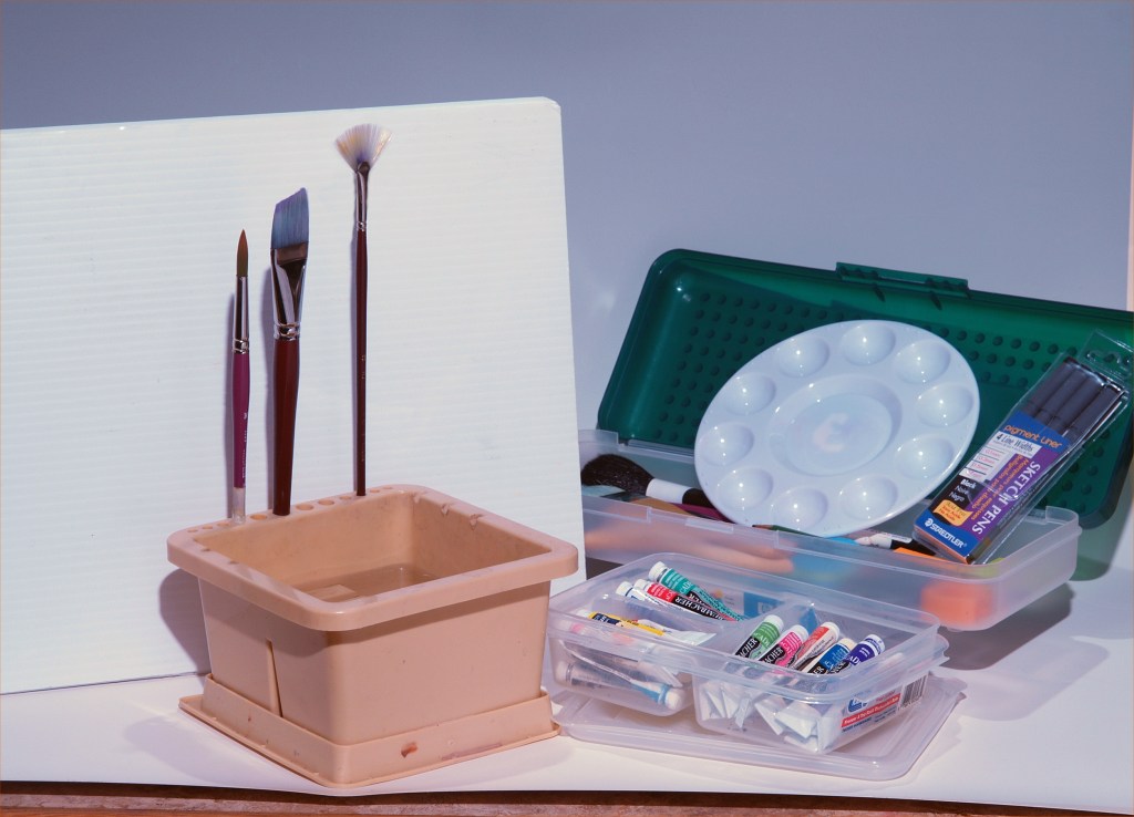 Storage containers: Two small plastic containers with lids, one for your tube paints and another for your other small supplies. All can be kept together in a cloth bag or a box. Whenever you are ready to paint, simply bring out the storage container.