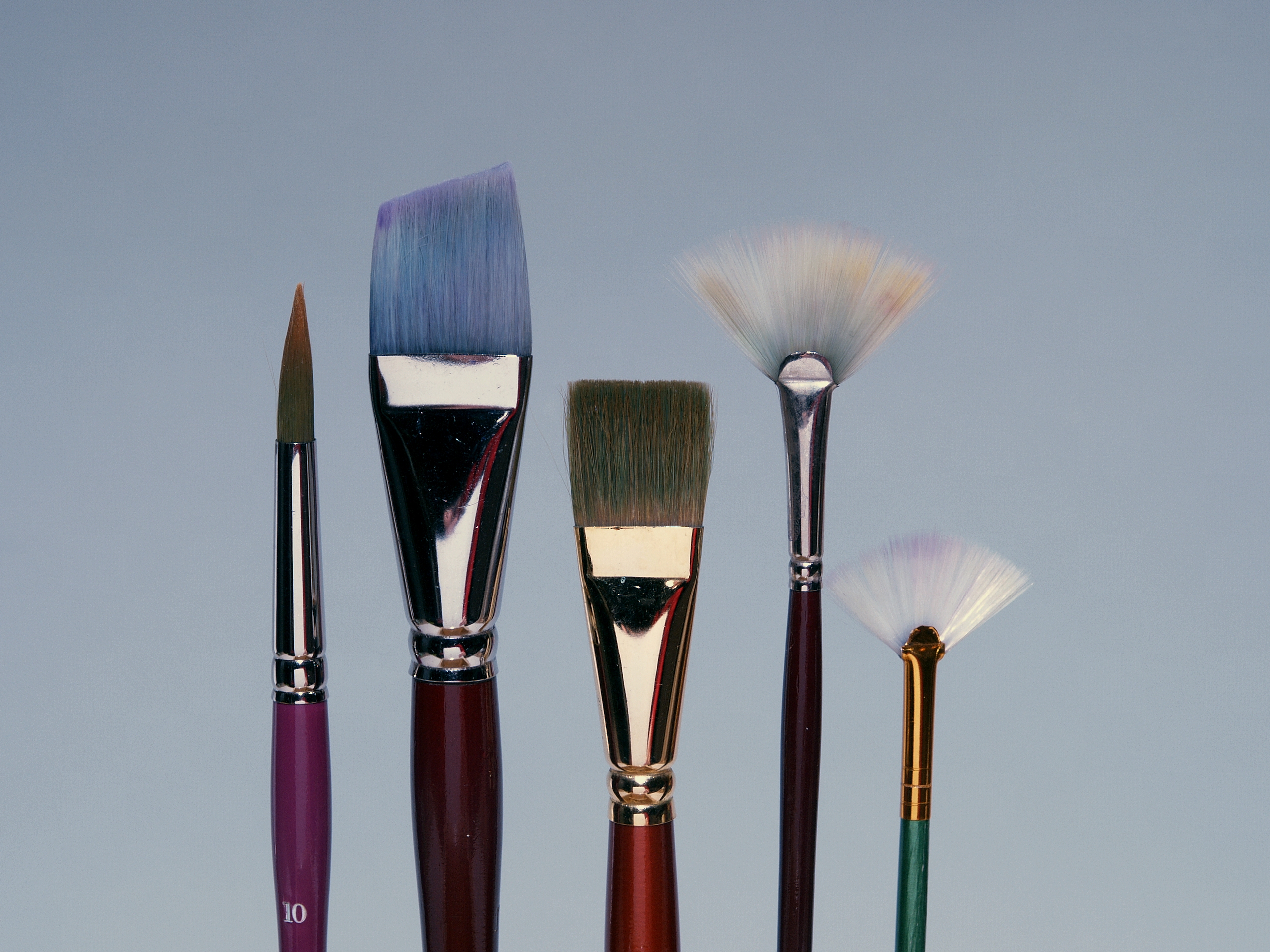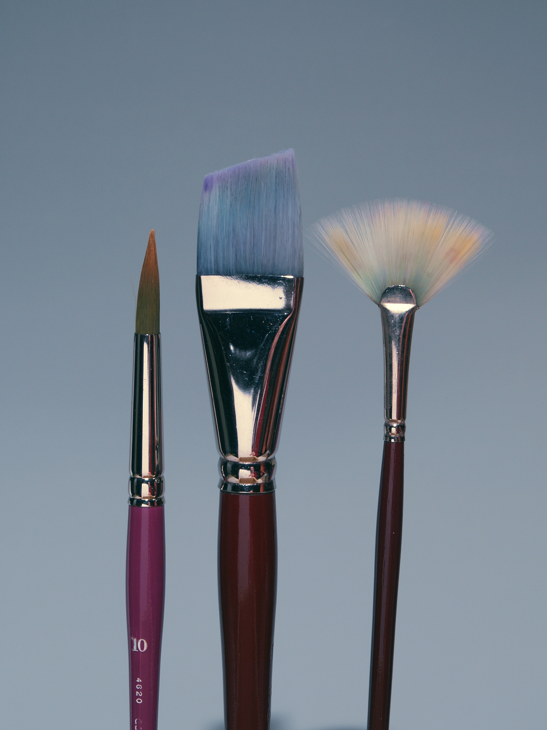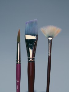 Above: Pointed round, angular shader, wash brush, fans. Brushes similar to the ¾” Winsor & Newton Sceptre Gold wash brush, shown in the center of this grouping, are more commonly used for washes than the angular shader, and may be easier to find.