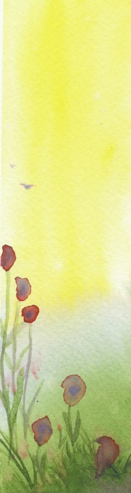Little Brown Bird soared high over an open meadow. Attracted to the striking red blooms below, he swooped down for a closer look. As he hovered above the blossoms, he spied some fat, juicy grubs wriggling in the earth. He lit on a flower stem, and was just about to hop to the ground, when out of the tall grasses strolled a sleek gray cat! Hoping the cat had not already noticed him, Little Brown Bird quickly pulled the petals of the flower around his tiny body and then stayed very still.