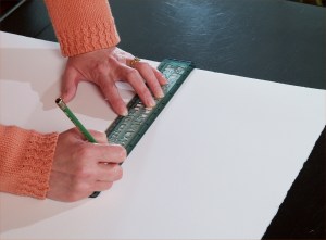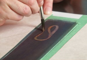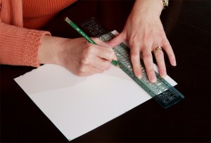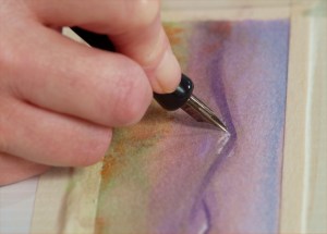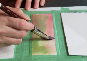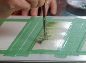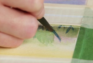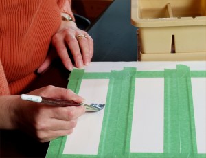 Decide what you’d like to say. Keep it simple, and practice writing it out on a piece of scrap paper before committing it to your painting. Once you begin, there is no turning back. If that thought makes you nervous, mock up the letters on your painting with a fine-point pencil first. Just take caution to pencil in as lightly as possible. The pigment liners are smear-free but may lift somewhat along with the pencil marks, should you need to use an eraser.