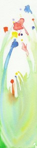 While journaling in the fall of 1995, I realized that I was writing in “small tight letters”. Over the next couple of weeks an occasional line of pure visual scrawl showed up on the pages. I started to write of wanting to make messes, to play, to “be loud on the paper”. Within two weeks, the sentence “Maybe I should be painting” spilled out. A month later, when the voice of my inner muse became even clearer and I was more comfortable with letting her have her way I wrote, “I’m getting too messy and it’s okay.” That day I penned three pages of large, graceful, flowing script.